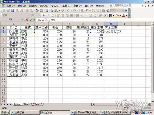第四步:关闭Visual Basic编辑器→在实发工资下输入=sss(G2,B2)→回车向下填充(图2)。