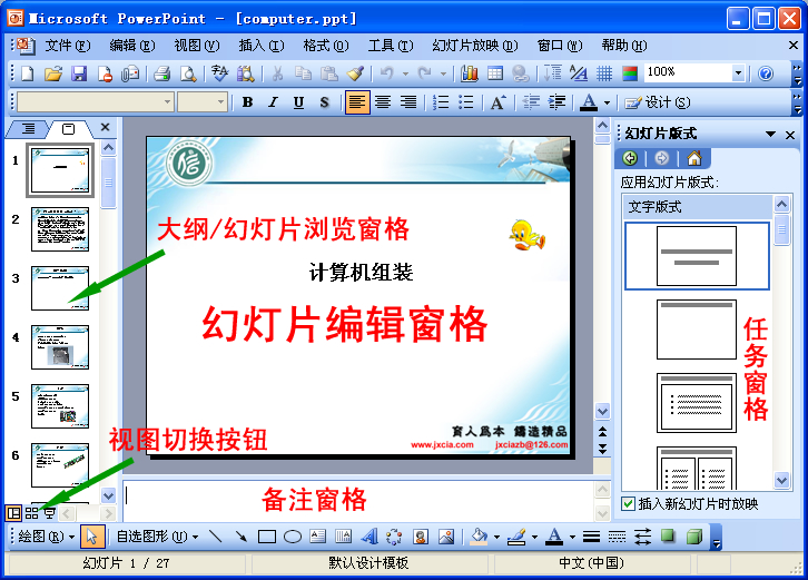 PowerPoint窗的工作界面如图所示,其标题栏、菜单栏、工具栏、状态栏等与Word、Excel相似。这里主要介绍视图和任务窗格。