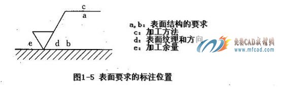 如图1-5所示,即为表面粗糙度要求的示例。一般情况下,我们只在c处标记出表面粗糙度的数值要求,其余的位置一般都是保持空白。