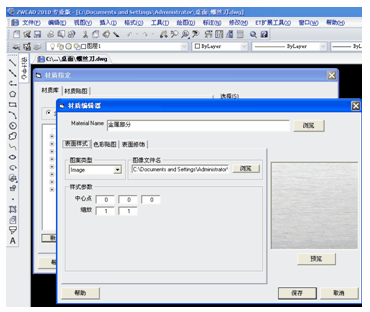 接下来,显示全部对象,准备为每个实体搭配材质。选择菜单“视图——渲染——材质”功能,命令行会有如下提示“指定材质到: <选择(S)>/图层(L)/颜色(C)/浏览(B):”,键入“S”,选择螺丝刀金属部分的两个实体,回车后进入材质指定对话框。在对话框中,点击左下角的新建对话框,新建一个具有金属特征的材质,如下图,输入新建的材质名称“金属部分”,图形类型选择“Image”,图像文件名里找到先前准备的金属样图,右侧的预览框内会显示图片的效果,最后保存,这样一个材质就建立好了。材质指定对话框中点击确定后,材质就加载到了实体上。