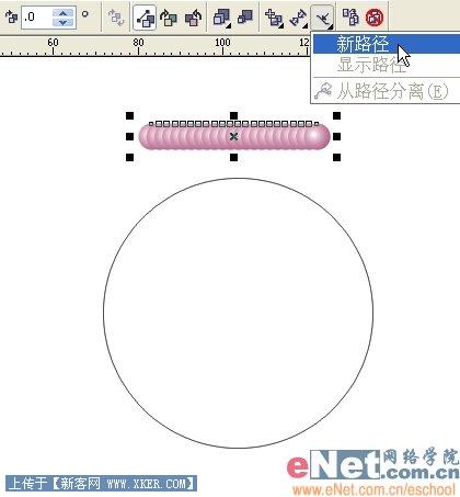 4、用椭圆工具画一个椭圆作为新路径。用交互式调和工具选中珍珠,在属性栏上点“新路径”,鼠标会变成弯曲的箭头状。