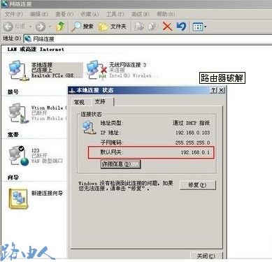 (1)打开“网上邻居”属性,查看“本地连接”的状态。在“支持”标签里,就会显示“默认网关”,这个就是本地路由器的地址了。