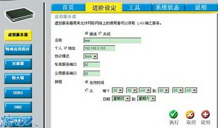 (1)进入D-LINK路由器进阶设定,选择虚拟服务器,填入Web服务器的相关参数,然后执行;