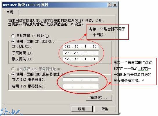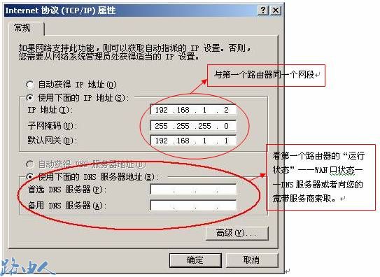(4)DNS服务器地址看第一个路由器的运行状态——WAN口状态——DNS服务器或者向您的宽带服务商索取。