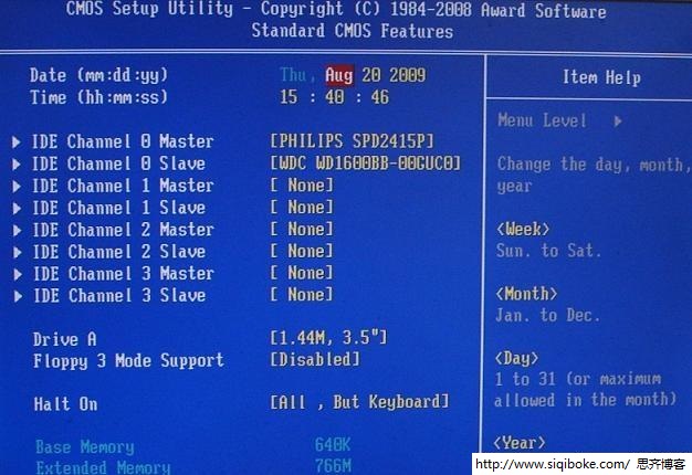 如果我们要在BIOS里调整系统时间,首先选择Standard CMOS features,然后通过移动光标到对应的时间或日期上,接着按键盘上的+、-键进行调整,最后保存(保存方法参下)即可,如下图: