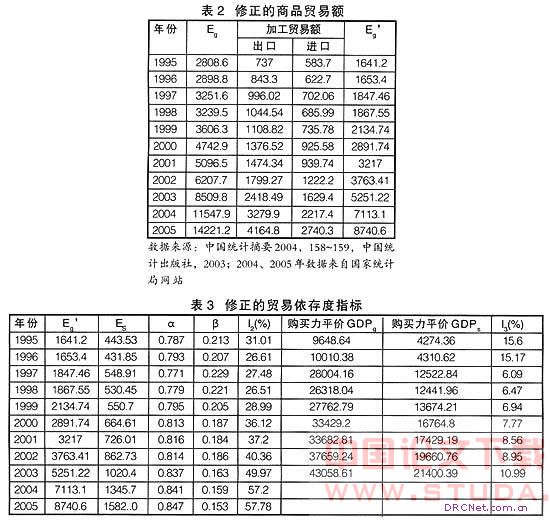 20世纪90年代以来,加工贸易额已经超过出口总额的50%,已经成为我国第一大贸易方式。加工贸易与一般贸易有许多不同之处,一般贸易的生产和加工要在国内完成,出口附加值可达60%以上;而加工贸易主要是来料、来样加工,从国外进口设备和原材料等投入品,产品直接出口国际市场,只有有限的生产加工程度在国内完成,且技术含量低。尽管近年来加工贸易的国内采购率和增值率有所上升,但与国内经济运行的联系不很密切。因此运用包含大量加工贸易在内的外贸依存度指标,会在相当程度上夸大我国经济对国际市场的依赖程度。加工贸易对GDP产生影响的只是进出口差额部分,所以为了反映加工贸易对我国国民经济的实际影响,在计算依存度时,应扣除加工贸易额,只计算其净出口额。而这些只影响商品贸易额,修正的商品贸易额计算公式为: