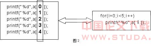 在C语言中,for语句经常与数组相结合,用于实现数组元素的赋值、输入与输出。对于初学者来说,更习惯于用顺序结构的语句来实现(如图2左)。我们将图2左的几条语句作比较,可以看出在这5条语句中,不同的只有数组下标,那么就可以将这5条语句合并成一条for语句,将数组下标换成for语句的循环变量i,而i的值从0增加到 4。按照for语句的基本语法规则可以很容易的写出图2右的for语句。
