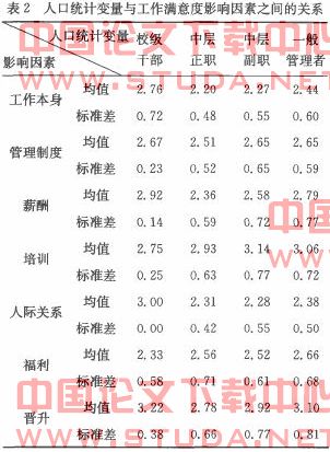 1.不同职级的管理人员和总体满意度之问关系的探索眭统计分析结果如表1所示。