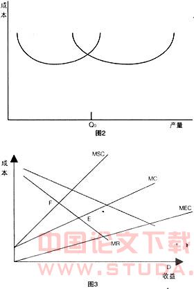 这些外部性的存在对旅游的发展是有伤害的。下面通过图3来分析和探讨解决途径。图中在不考虑社会成本的情况下,开发商的边际成本为MC,边际收益为MR,根据利润最大化原则,即MR=MC,商家将选择在E点生产经营。但当把边际社会成本MEC考虑在内时其总成本变成了MSC(MSC=MC+MEC)。这时的均衡点应该在F点。显然,E点的均衡收益大于F点的均衡收益。在旅游资源开发中,这种不同的收益表示两层意思:由于开发商不用考虑外部成本问题,过度开发旅游资源;由于旅游者没有承担在旅游活动中对资源的破坏和环境的污染的成本,从而造成旅游商品价格偏低,游客量偏高。
