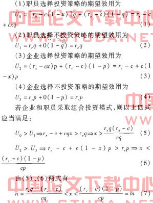 那么,在满足(7)式的前提下,当P很大、q很小时。即职员倾向于投资、企业倾向于不投资时,m趋近于0,n将小于0,的取值也接近于0。这说明在这种投资情况下,企业在组合投资中承担的投资成本很少,接近于不投资。同样,当P很小、q很大时,即职员倾向于不投资、企业倾向于投资时,m趋近于无穷,n趋近于I,的取值接近于1。这说明在种投资情况下,企业在组合投资种承担的投资成本很多,接近于全部。由此可见,通过(7)式可将贝克尔投资模式和组合投资模式结合起来。