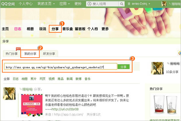 一、登录您的QQ空间,点击分享,进入分享页面点击“我的分享”;网址栏输入您想要分享的网址,点击“分享给好友”即可成功。